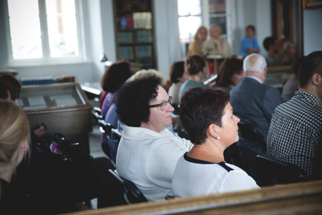 Moments from the reading event at the White Hall of Vilnius University Library, during which Lithuanian actor Rolandas Kazlas read poems by Vladas Šimkus.