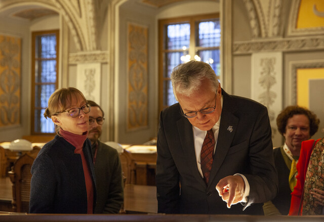 During his visit the Head of State had the opportunity to view the oldest manuscript owned by VU Library – a parchment dating back to 1209 – as well as other documents important to the Lithuanian heritage. Among these documents was a manuscript of translation of the Holy Bible by Antanas Baranauskas, which has been included in the Lithuanian register of UNESCO “Memory of the World” programme.