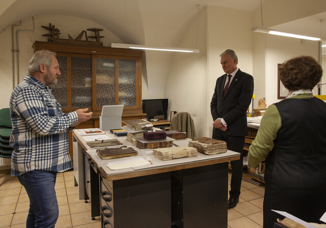 During his visit the Head of State had the opportunity to view the oldest manuscript owned by VU Library – a parchment dating back to 1209 – as well as other documents important to the Lithuanian heritage. Among these documents was a manuscript of translation of the Holy Bible by Antanas Baranauskas, which has been included in the Lithuanian register of UNESCO “Memory of the World” programme.
