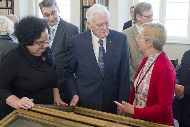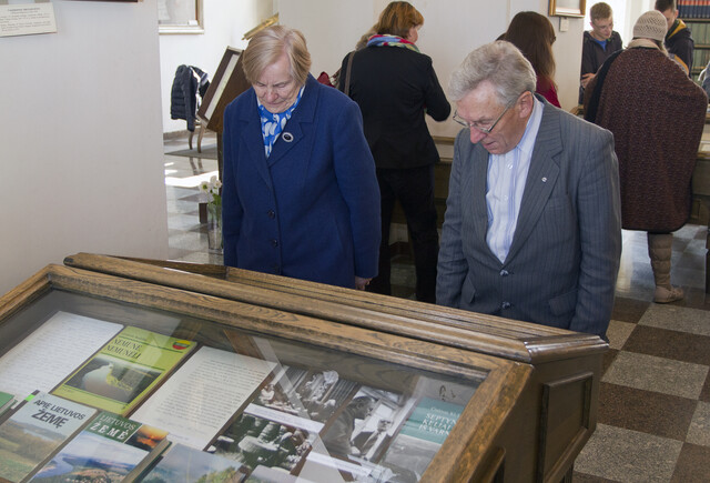 Moments from the opening of the exhibition dedicated to Česlovas Kudaba, which took place at the White Hall of Vilnius University Library.